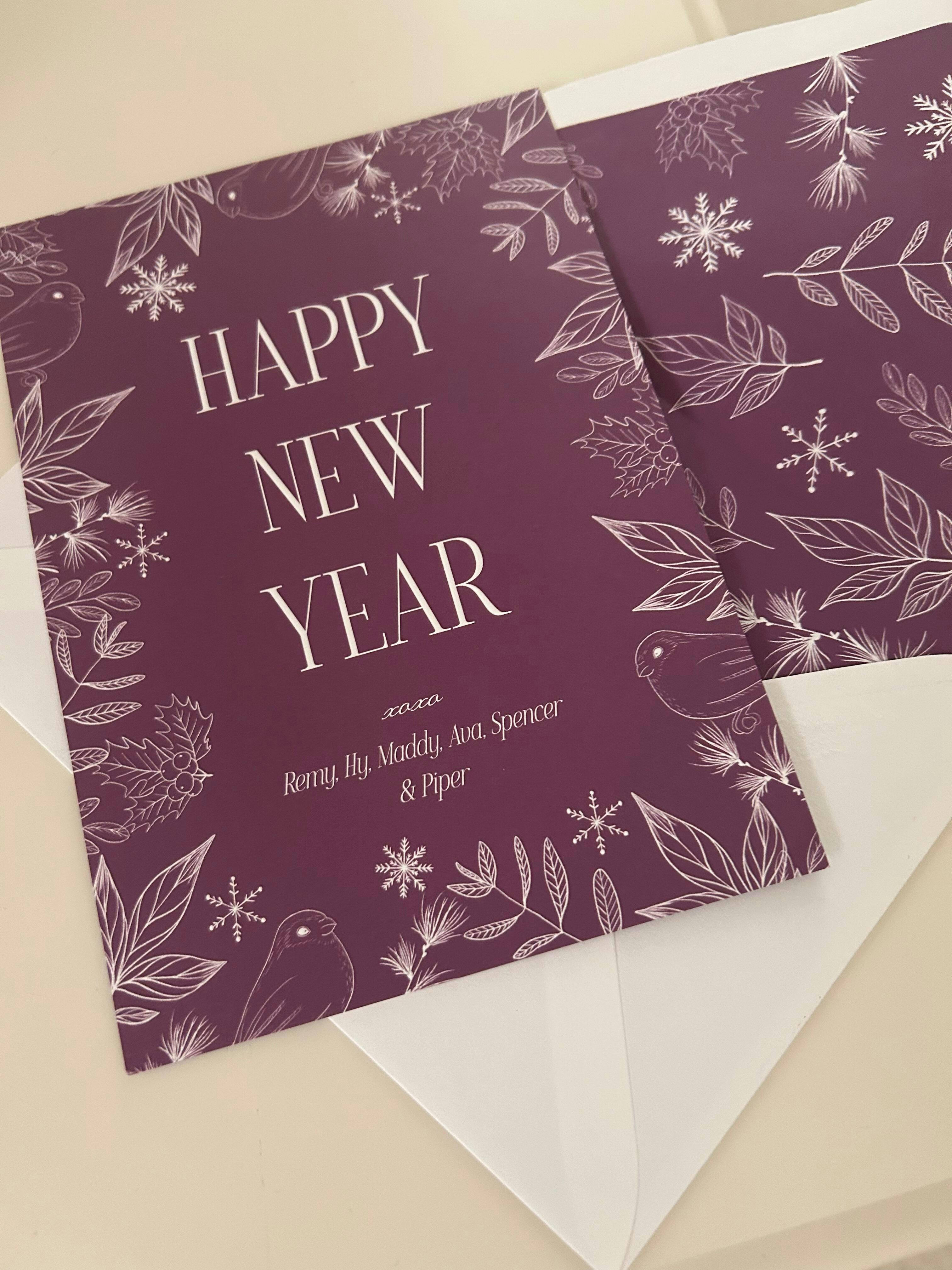 Welcome the new year with warmth and style using our Winter Forest Happy New Year Card. This elegant design features a background that can be customized to match any color from the Blú Rose palette, adorned with delicate white illustrations of winter foliage and birds. The serene and festive atmosphere created by this design is perfect for celebrating the start of a new year. The simple yet striking "Happy New Year" message in classic typography takes center stage, offering a perfect blend of modern charm and timeless elegance.